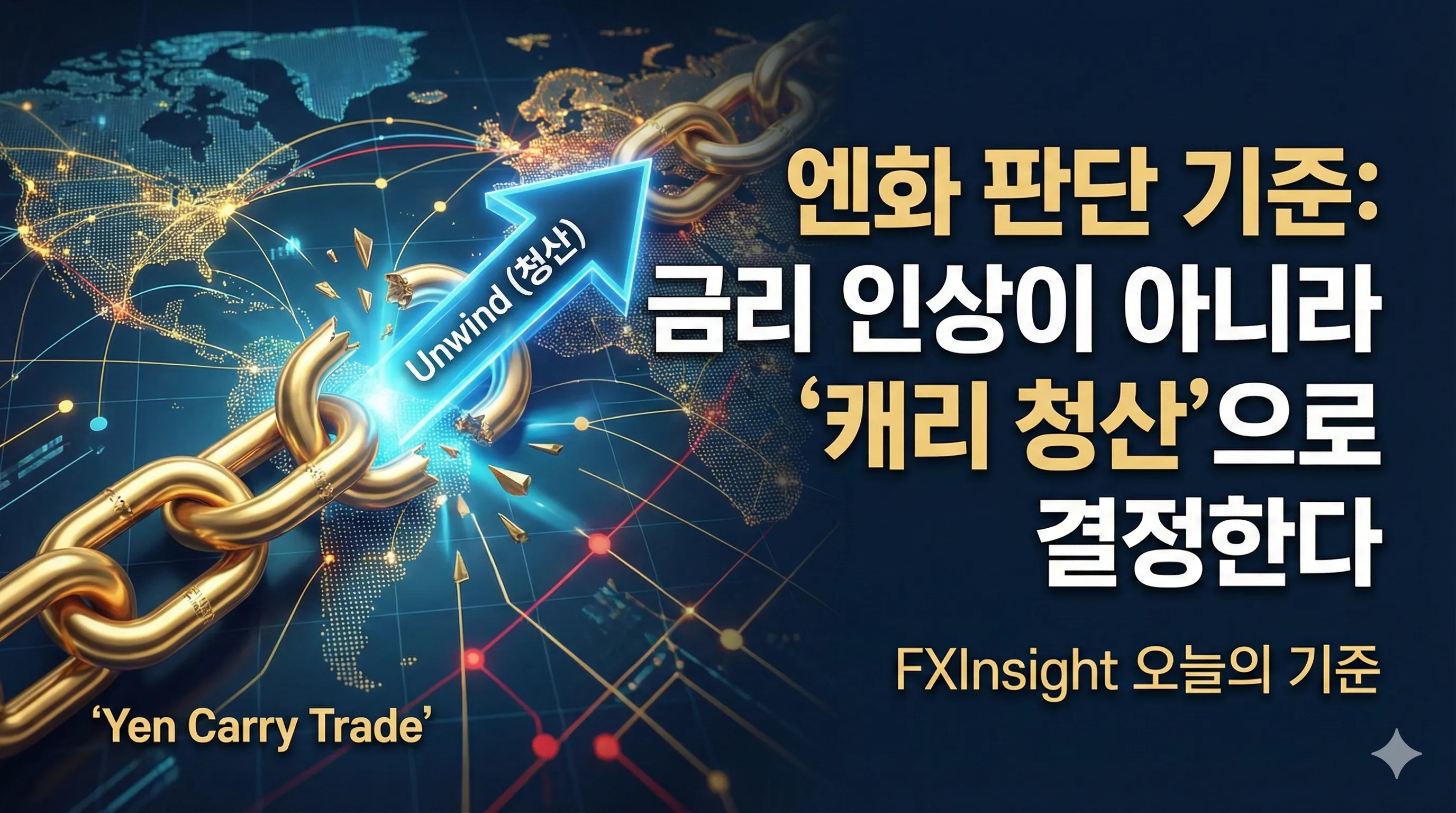 엔화 판단 기준: 금리 인상이 아니라 ‘캐리 청산’으로 결정한다2026년 1월 28일 현재, 일본은행(BOJ)의 정책 금리 인상에도 불구하고 엔화는 여전히 150엔대 중반의 약세를 면치 못하고 있습니다. 시장은 금리라는 숫자보다 더 강력한 힘에 의해 움직이고 있기 때문입니다. 오늘은 금리 인상 뉴스(A)가 아니라, 글로벌 자금의 대이동인 ‘엔 캐리 트레이드 청산’(B)이 시작되었는지만으로 “엔화 매수 vs 관망”을 나누는 기준을 남깁니다.Context 2026.01.28 엔/달러 155엔대 유지 (BOJ 매파적 스탠스에도 엔저 지속)Trigger BOJ의 금리 인상 폭(A)이 아니라 '주요국 금리 하락 및 변동성 확대'(B)이 글은 이런 분을 위해 썼습니다일본 금리가 오르는데 왜 엔화 가치는 떨어지는지 ..
